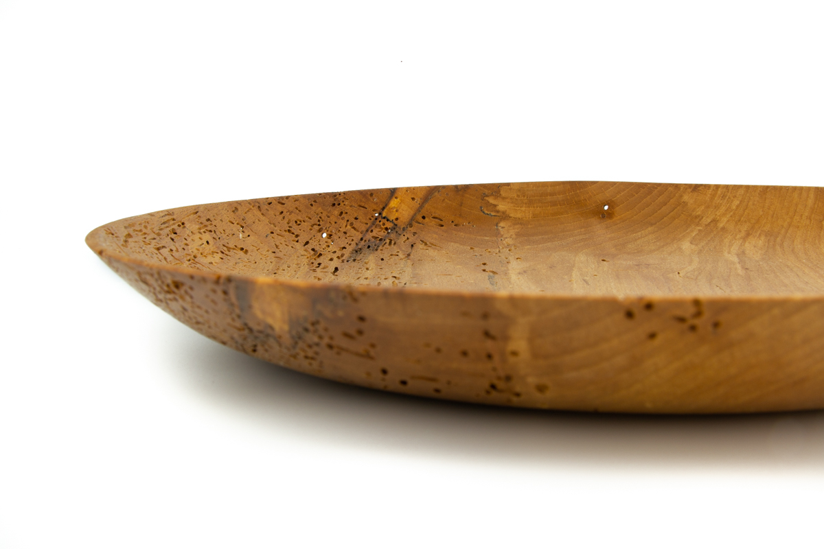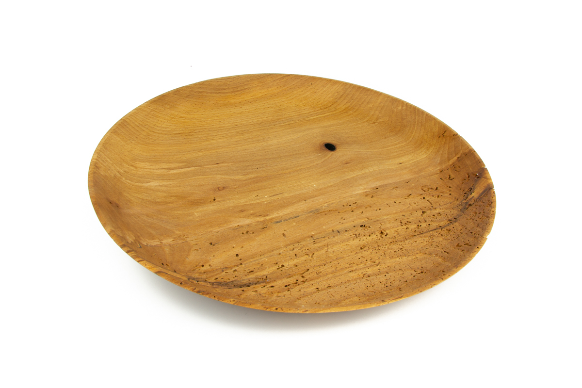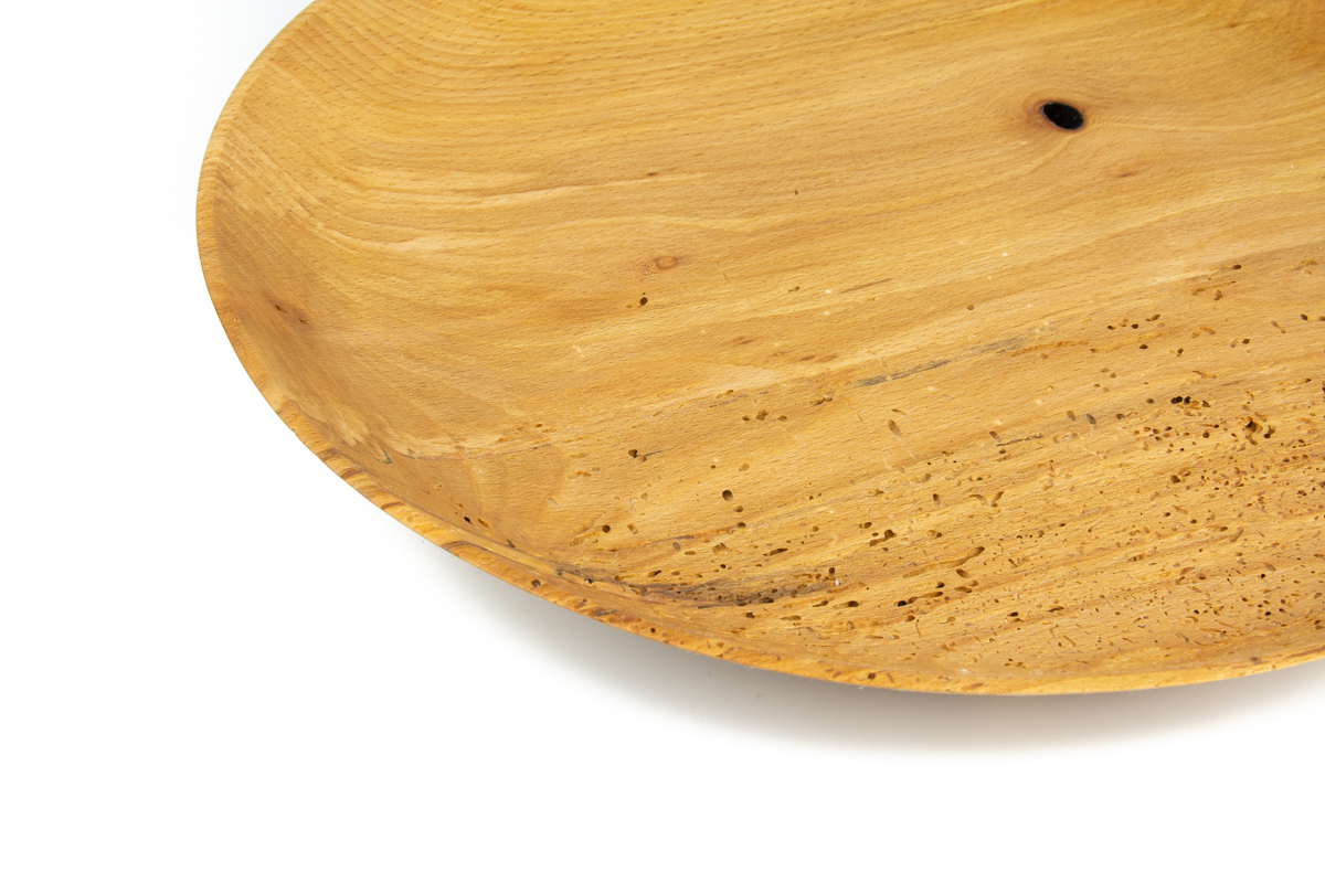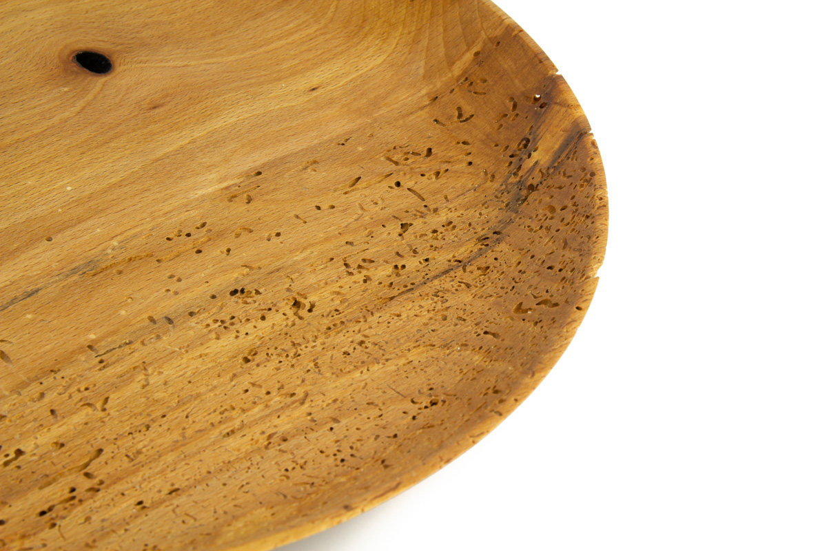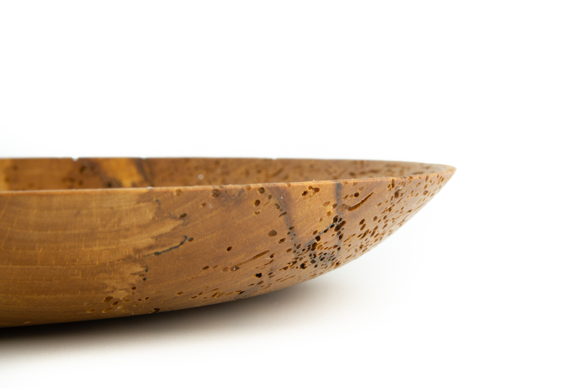 Informationen zum Unikat "Flache Schale aus gestockter Buche mit Wurmbefall"