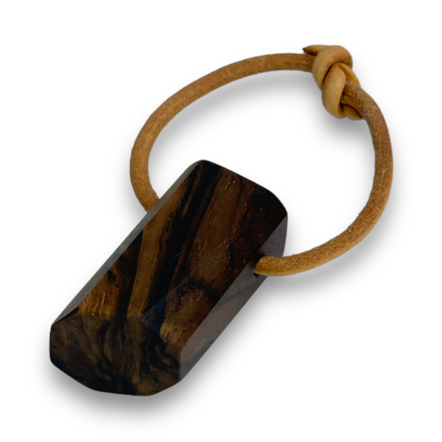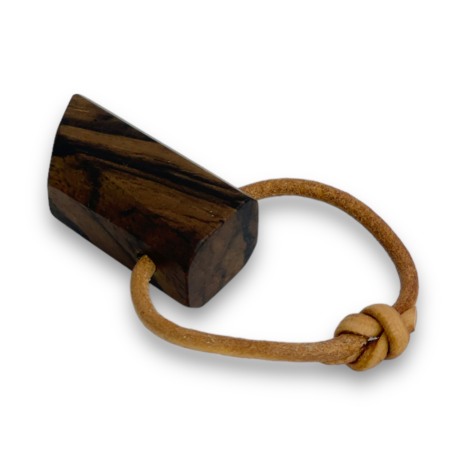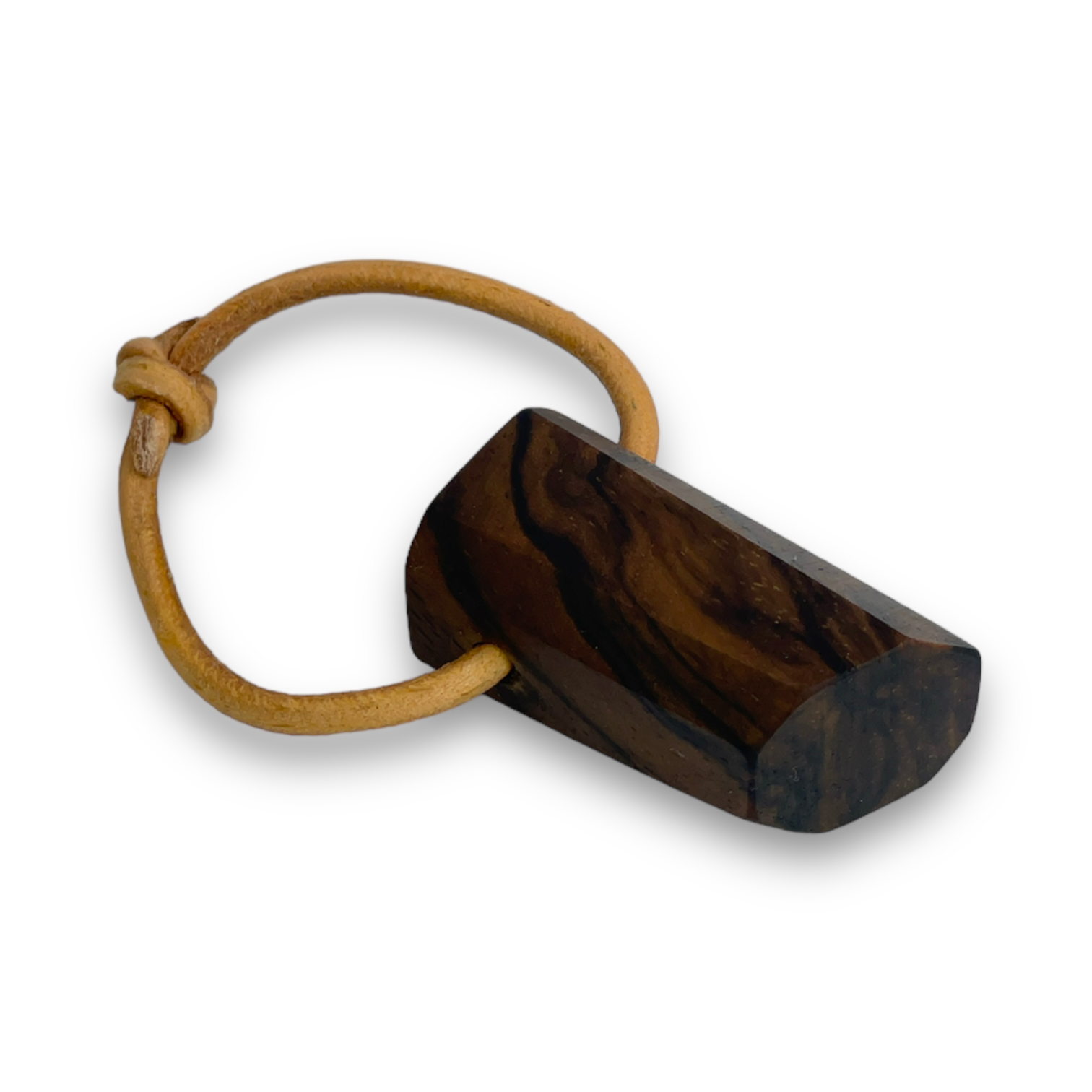 Ein Schlüsselanhänger und zugleich Handschmeichler mit einem festen Lederbändchen. Die angegebenen Maße beziehen sich nur auf den Holzteil des Anhängers.