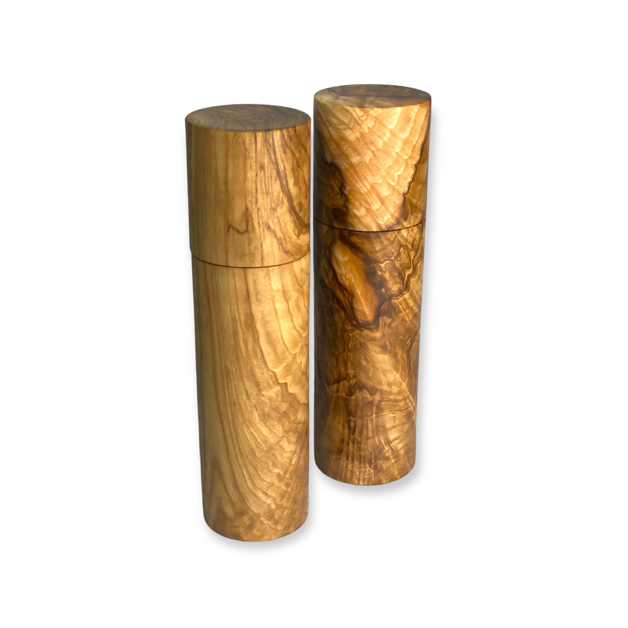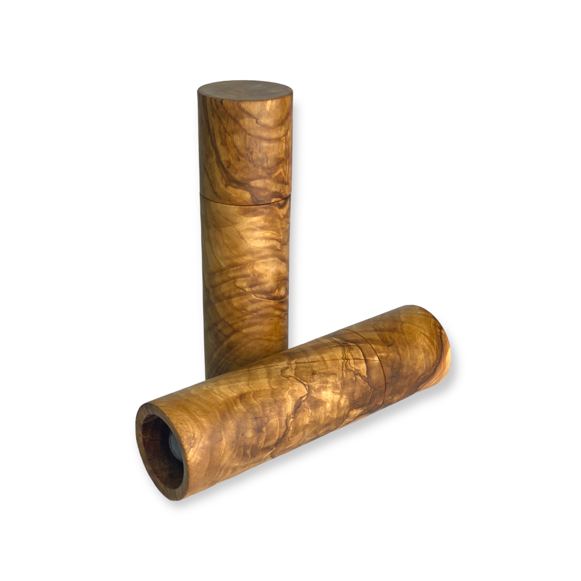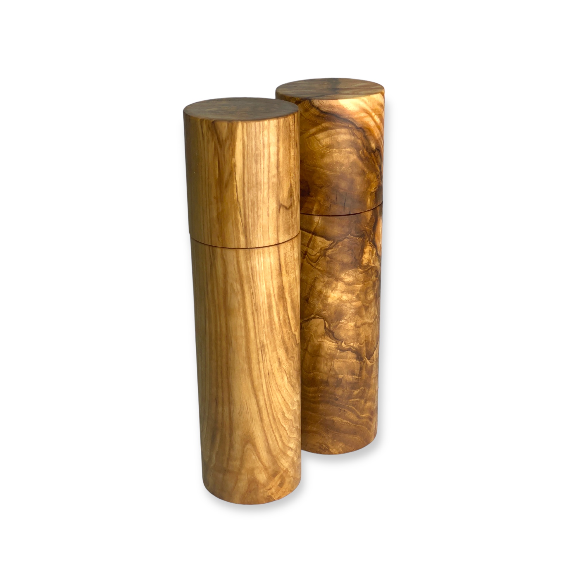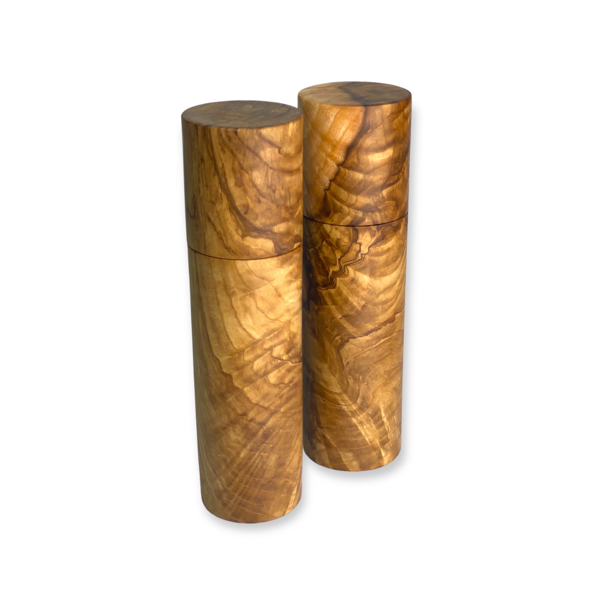 Dieses wunderschöne Mühlenpaar aus geriegelter Olivkernesche ist ein echter Hingucker. Die Maserung ist atemberaubend. Die Riegel und der Schimmer, ein Traum! Das Holz dafür stammt aus Friedmannsdorf bei Zell im Fichtelgebirge. Der ursprünglicher Eigentümer hat sich daraus eine Treppe für sein Haus gebaut und einige Abschnitten waren übrig und sollten als Feuerholz dienen. So haben die beiden neues Leben bekommen.