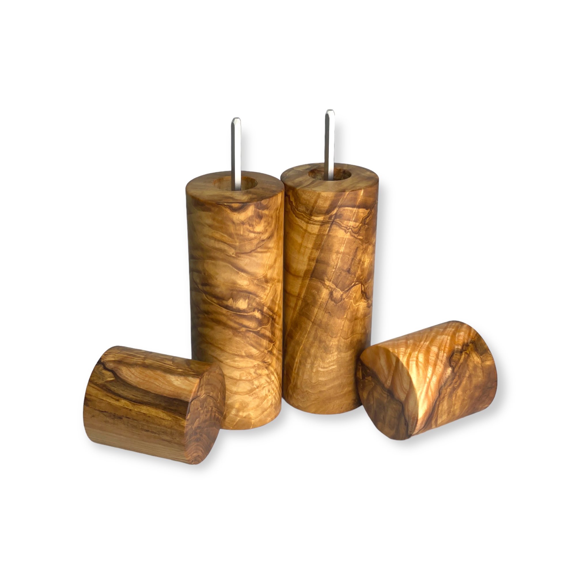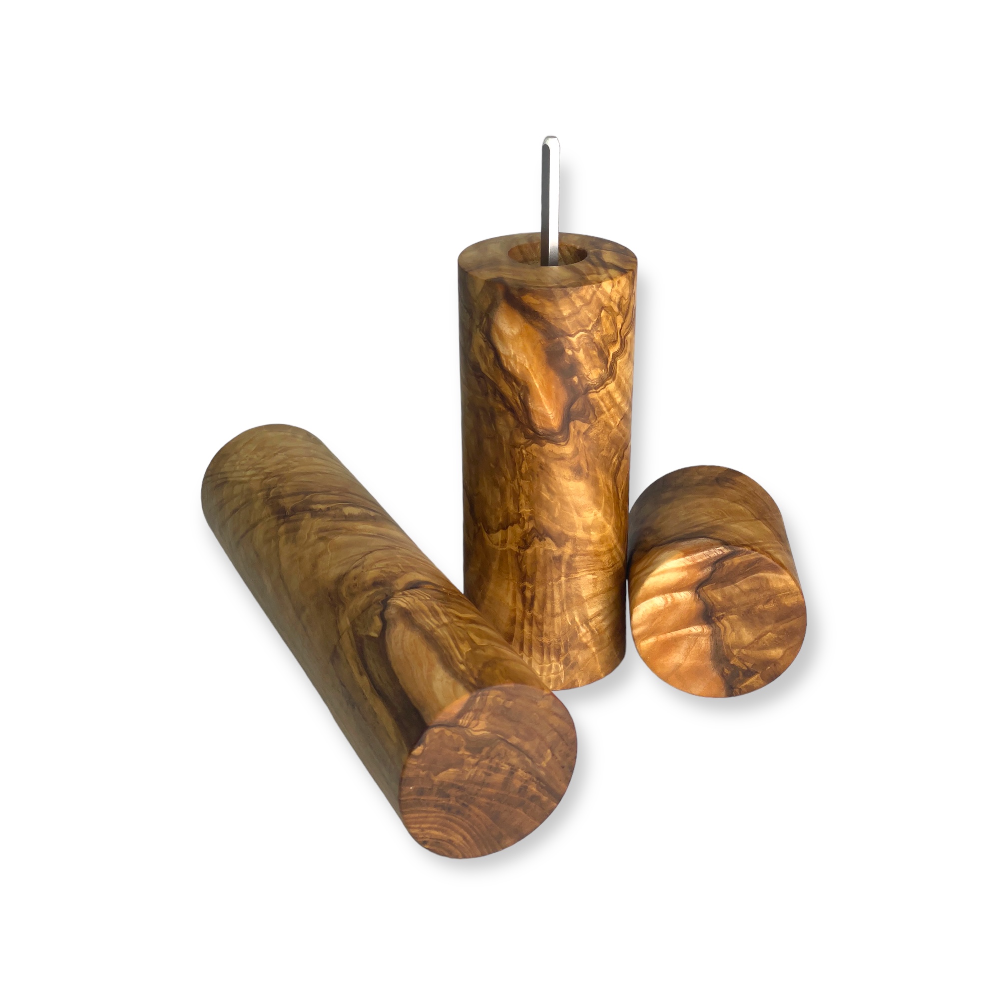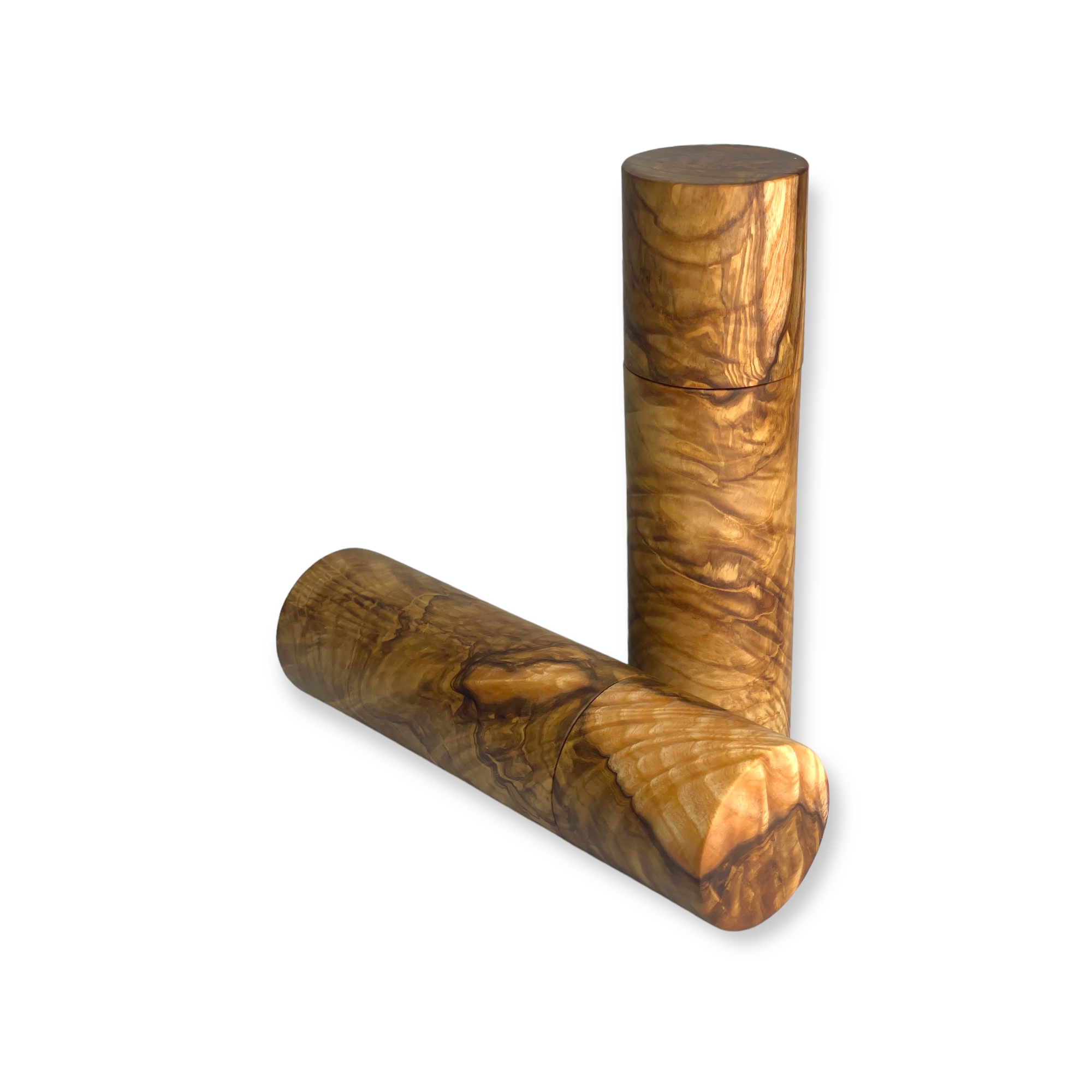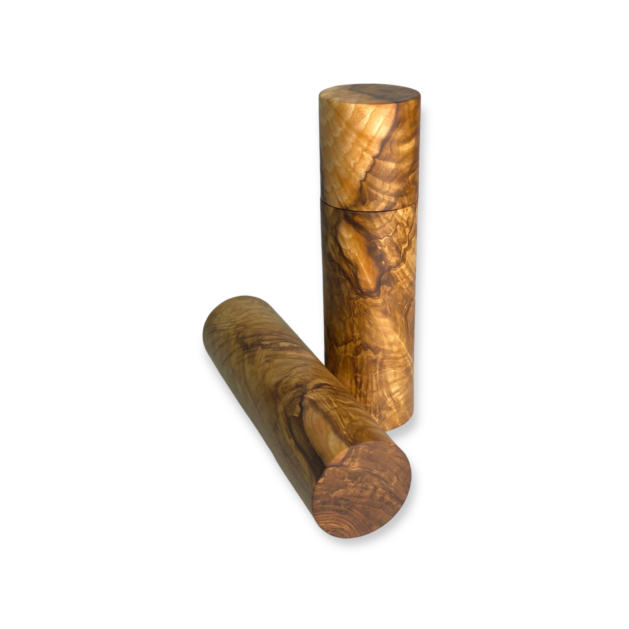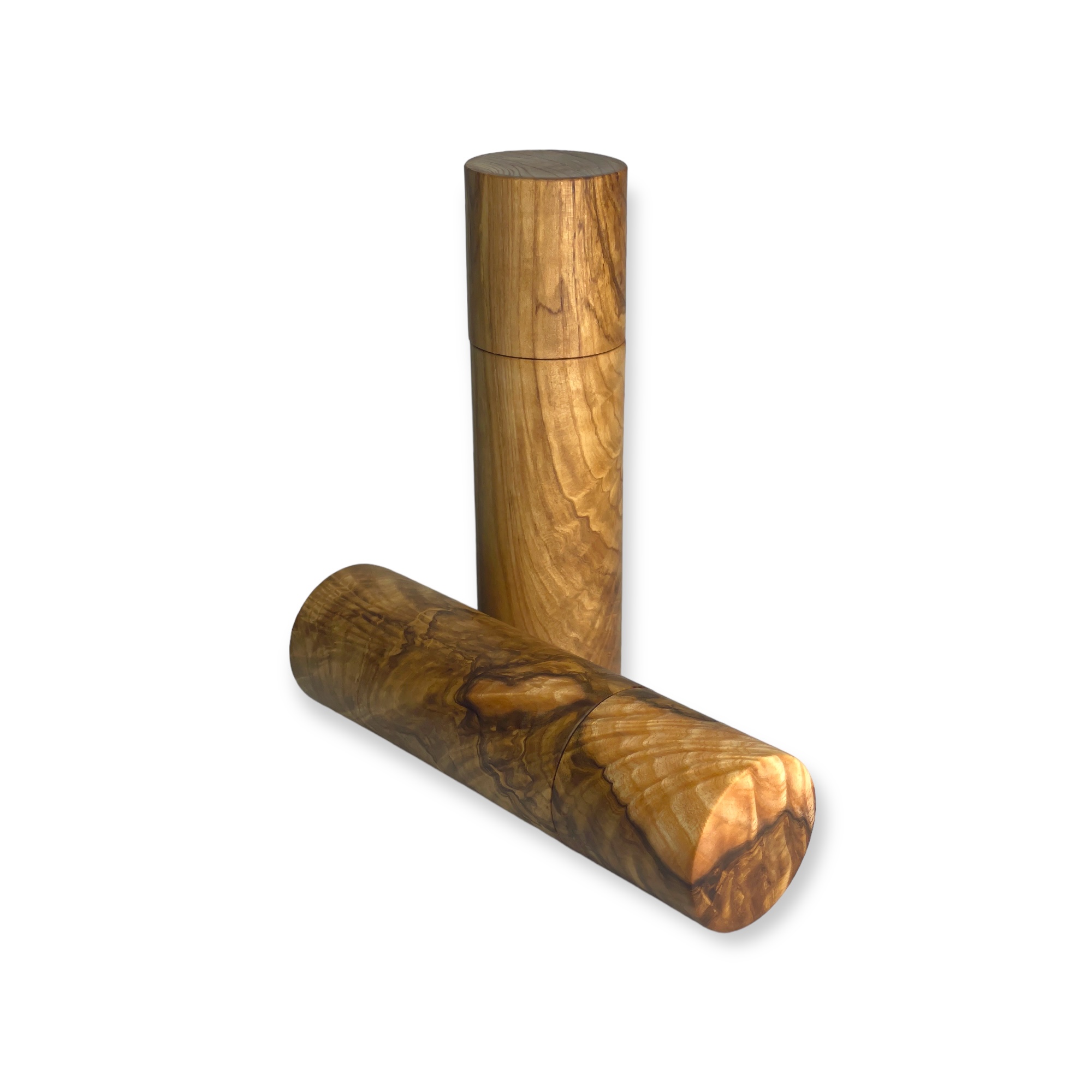 Dieses wunderschöne Mühlenpaar aus geriegelter Olivkernesche ist ein echter Hingucker. Die Maserung ist atemberaubend. Die Riegel und der Schimmer, ein Traum! Das Holz dafür stammt aus Friedmannsdorf bei Zell im Fichtelgebirge. Der ursprünglicher Eigentümer hat sich daraus eine Treppe für sein Haus gebaut und einige Abschnitten waren übrig und sollten als Feuerholz dienen. So haben die beiden neues Leben bekommen.