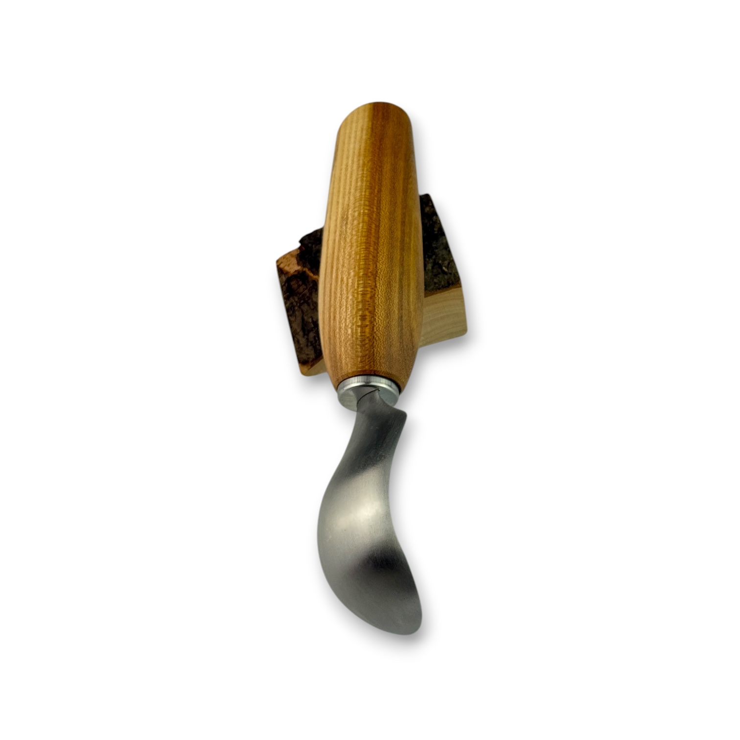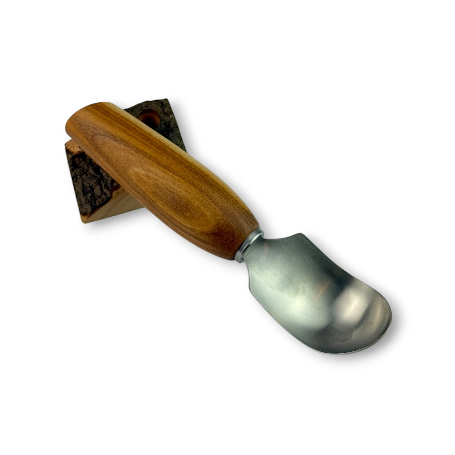 Der fein geschärfte Löffelkopf gleitet mühelos durch Melonen, Kürbis, Zucchini oder sogar Eis, während der von Hand gedrechselte Holzgriff angenehm in der Hand liegt und jedes Stück zum einzigartigen Unikat macht.