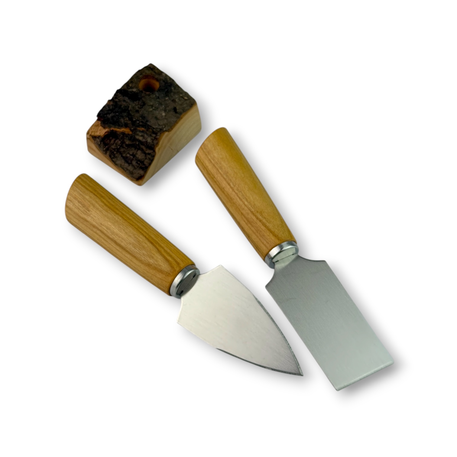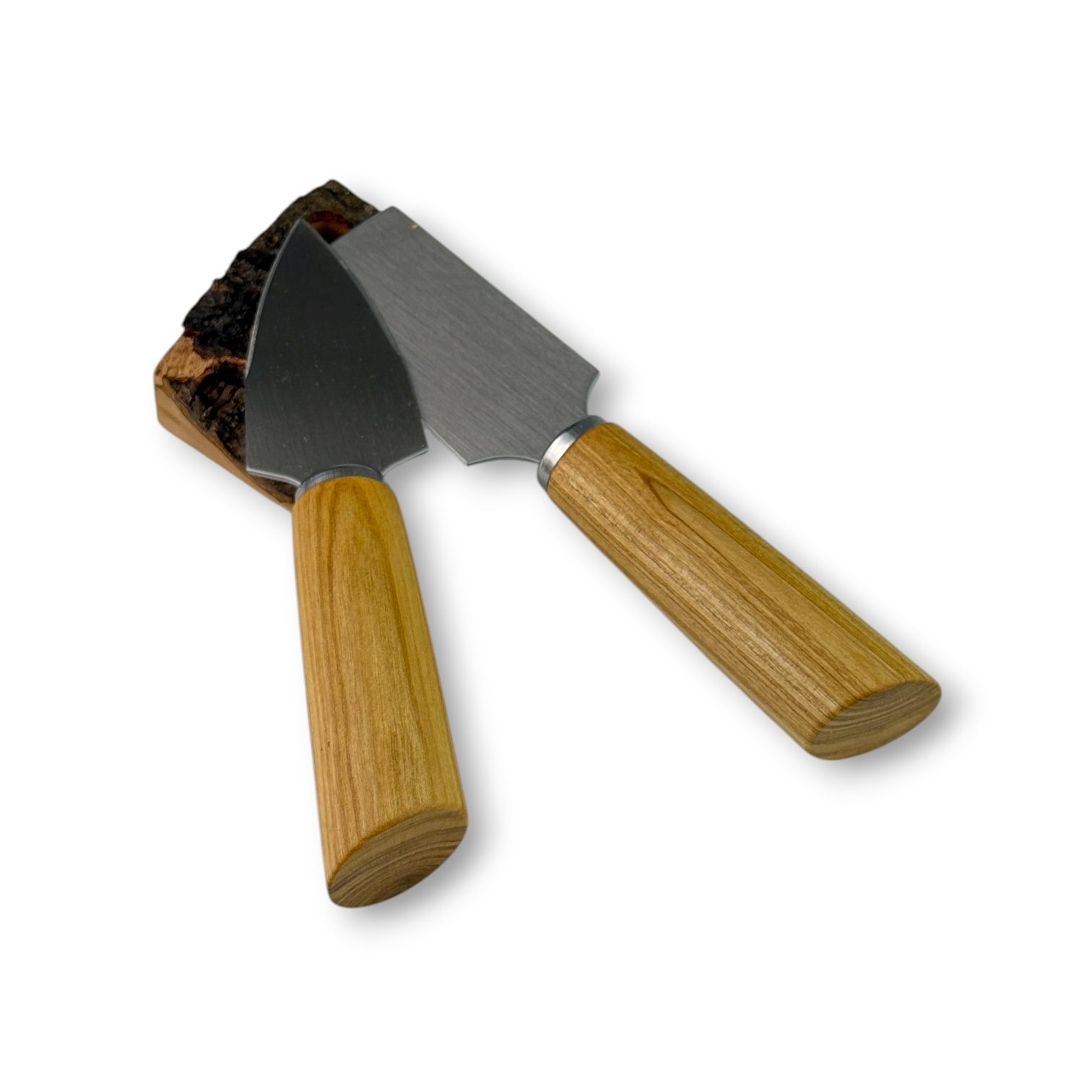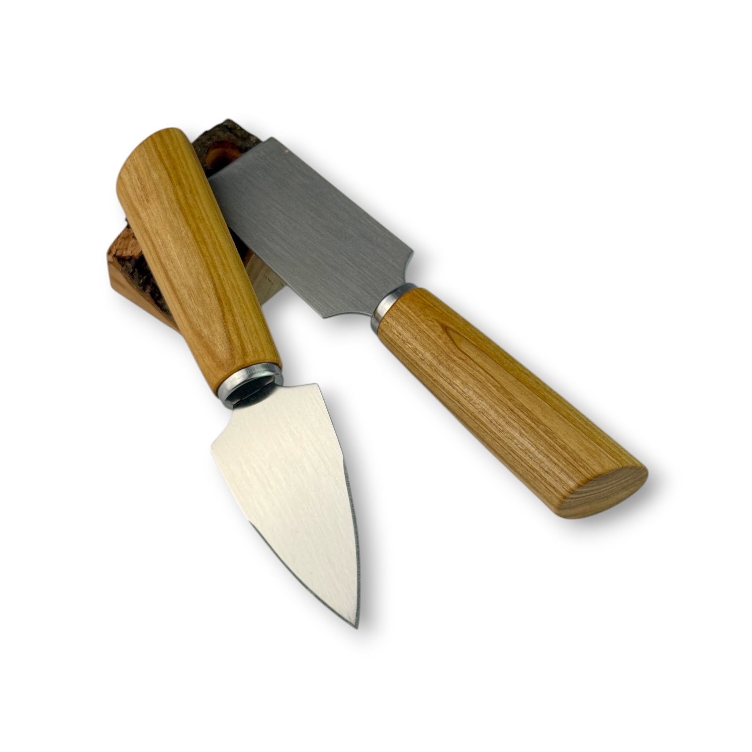Das Set umfasst zwei Varianten: ein Messer mit gerader Klinge und eines mit spitzer Klinge – perfekt zum Brechen von Parmesan und anderen lange gereiften Hartkäsesorten. Beide Klingen sind besonders stabil und liegen durch den handgedrechselten Holzgriff angenehm in der Hand.