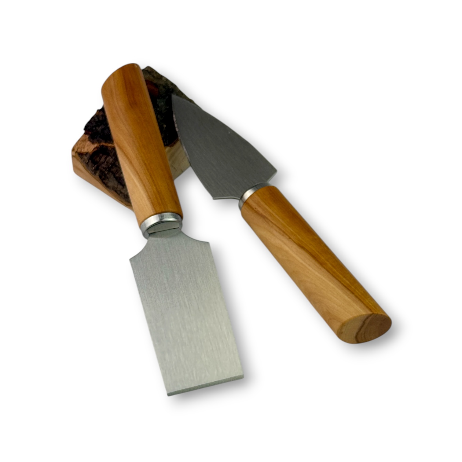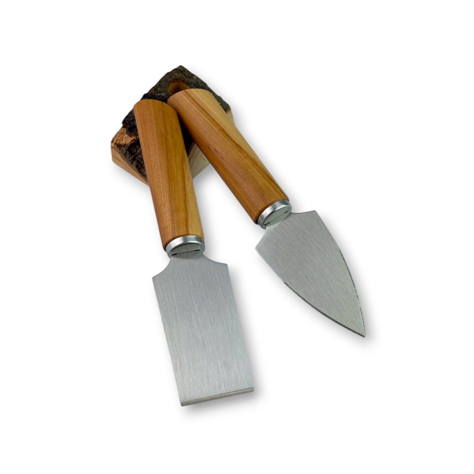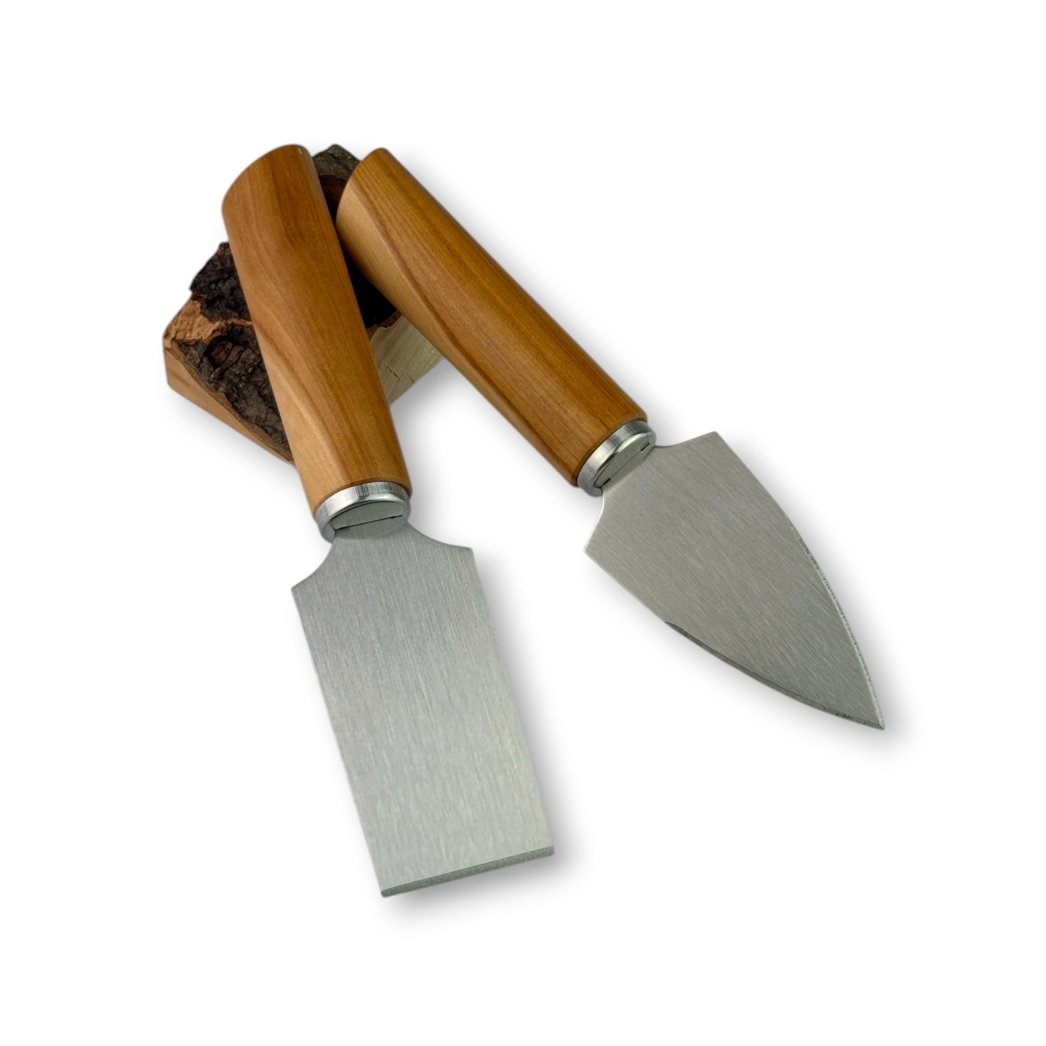 Das Set umfasst zwei Varianten: ein Messer mit gerader Klinge und eines mit spitzer Klinge – perfekt zum Brechen von Parmesan und anderen lange gereiften Hartkäsesorten. Beide Klingen sind besonders stabil und liegen durch den handgedrechselten Holzgriff angenehm in der Hand.