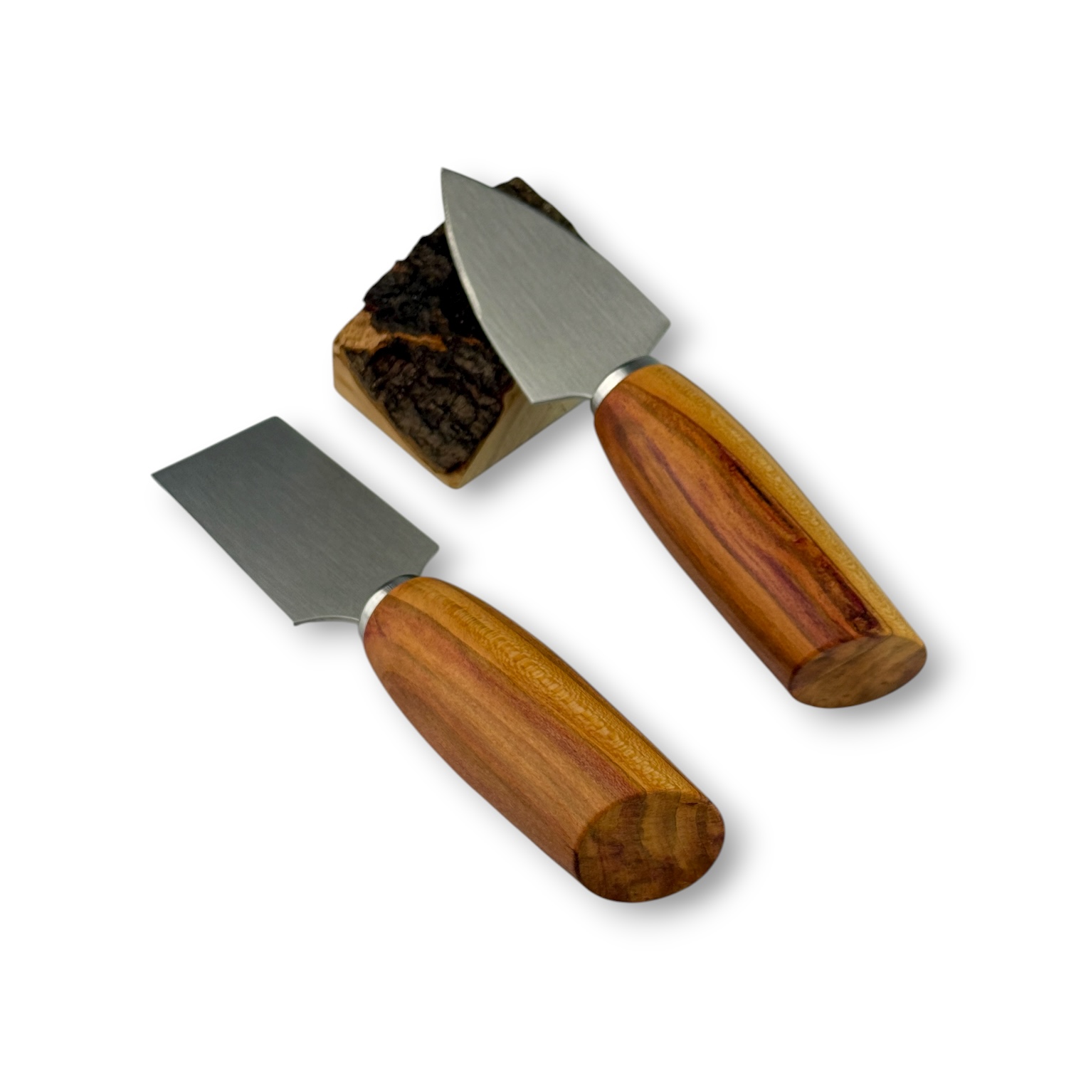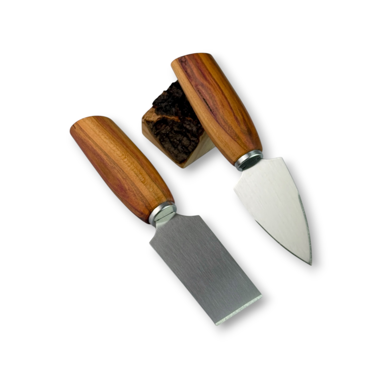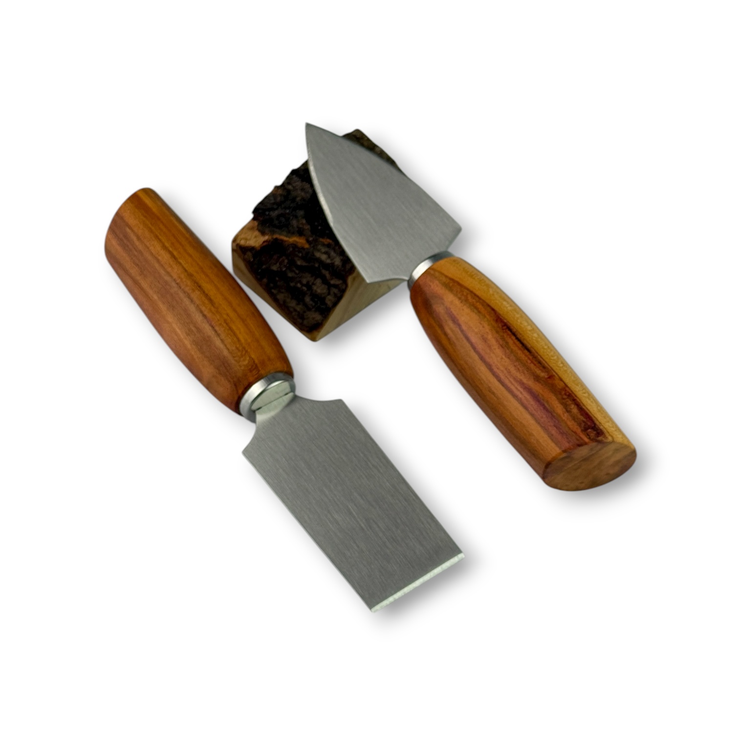 Das Set umfasst zwei Varianten: ein Messer mit gerader Klinge und eines mit spitzer Klinge – perfekt zum Brechen von Parmesan und anderen lange gereiften Hartkäsesorten. Beide Klingen sind besonders stabil und liegen durch den handgedrechselten Holzgriff angenehm in der Hand.