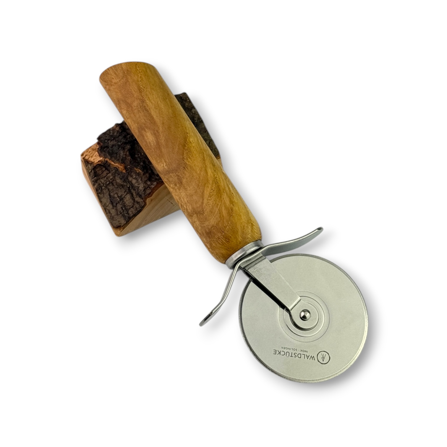 Der Pizzaschneider, ist der perfekte Helfer für jeden Hobby-Pizzabäcker oder Backkönig. Ob Pizza, Flammkuchen, Nudelteig oder auch flacher Kuchen, mit dem Pizzacutter ist es ein Leichtes zu schneiden. Das Holz ist mit natürlichen Ölen und Wachsen versiegelt und somit vollkommen lebensmittelecht. Die Klinge des Pizzacutters ist von einer Qualitätsfirma aus dem deutschen Solingen und besteht aus Edelstahl. Die Klinge hat einen Durchmesser von 6cm und ist sehr scharf!