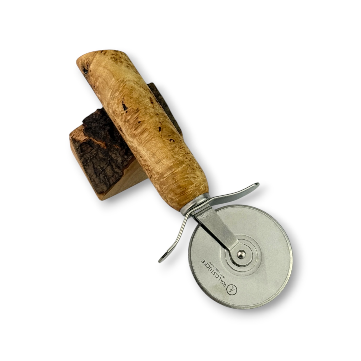 Das gemaserte Ahornholz für diesen Pizzaschneider kommt aus Kronach.