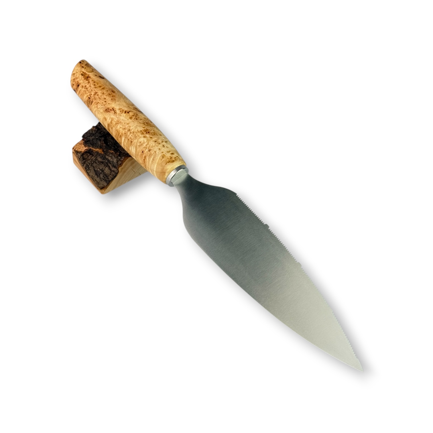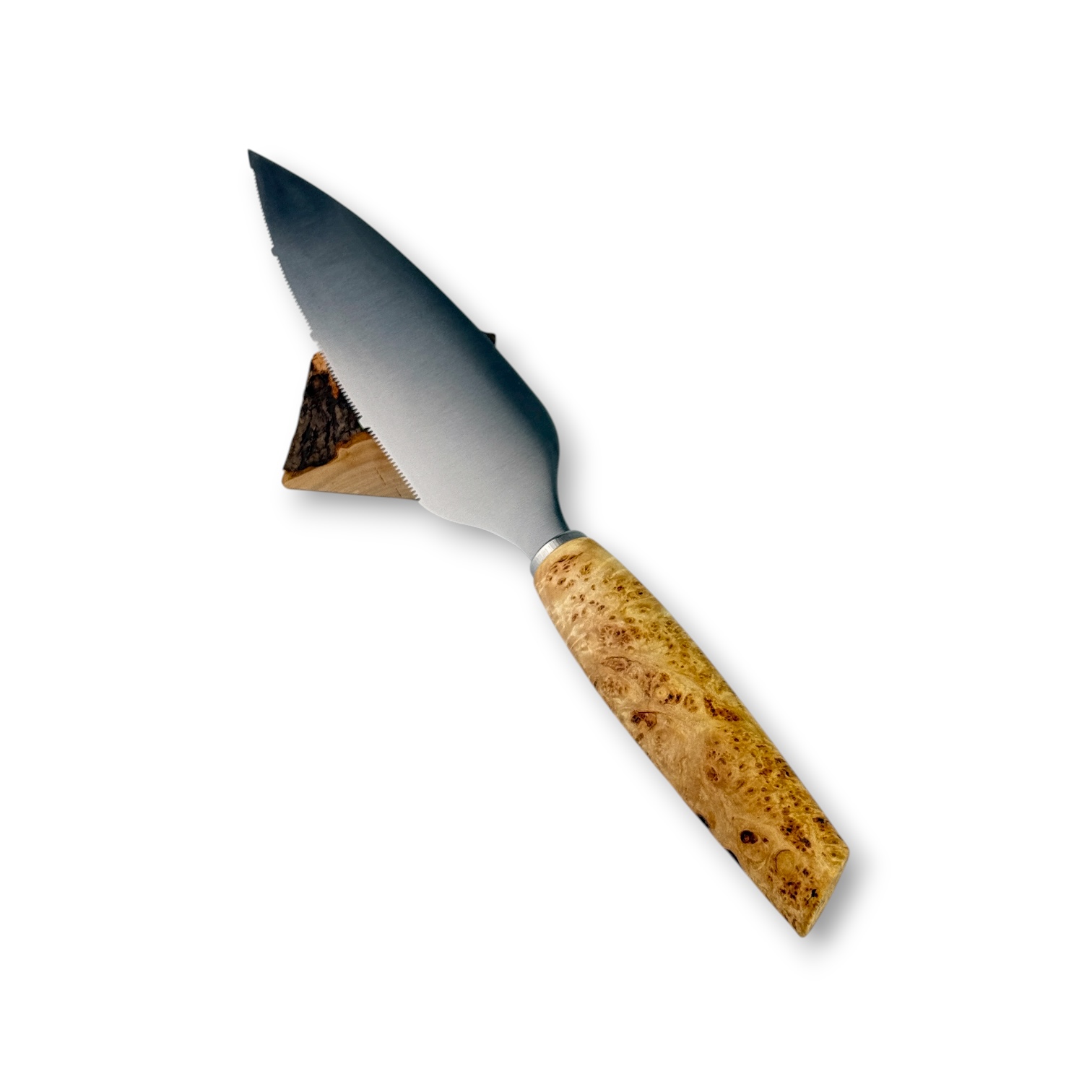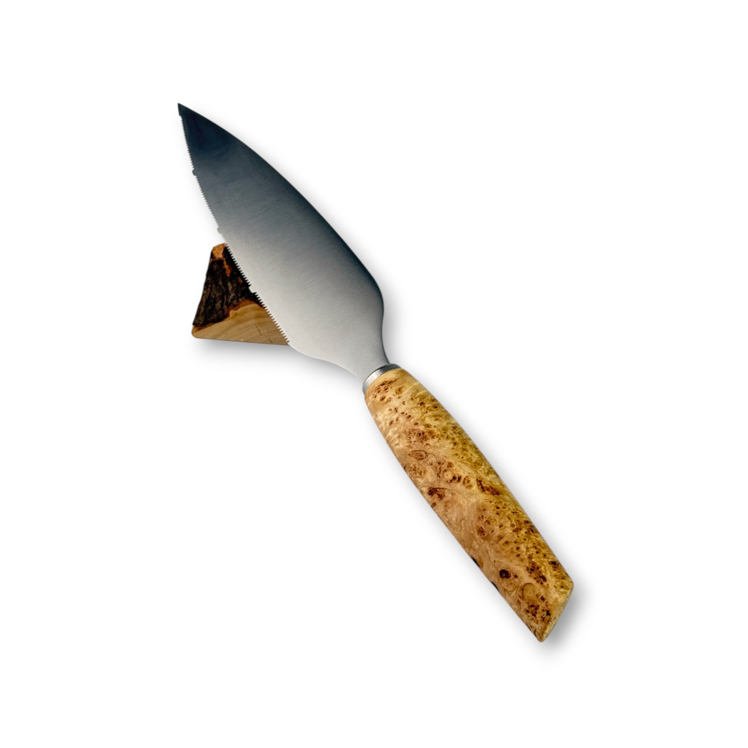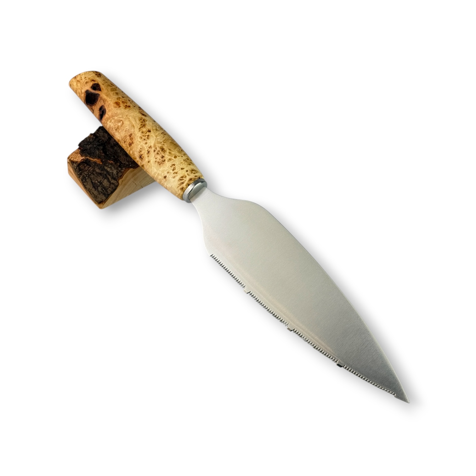 Das gemaserte Ahornholz für dieses Tortenmesser kommt aus Kronach.