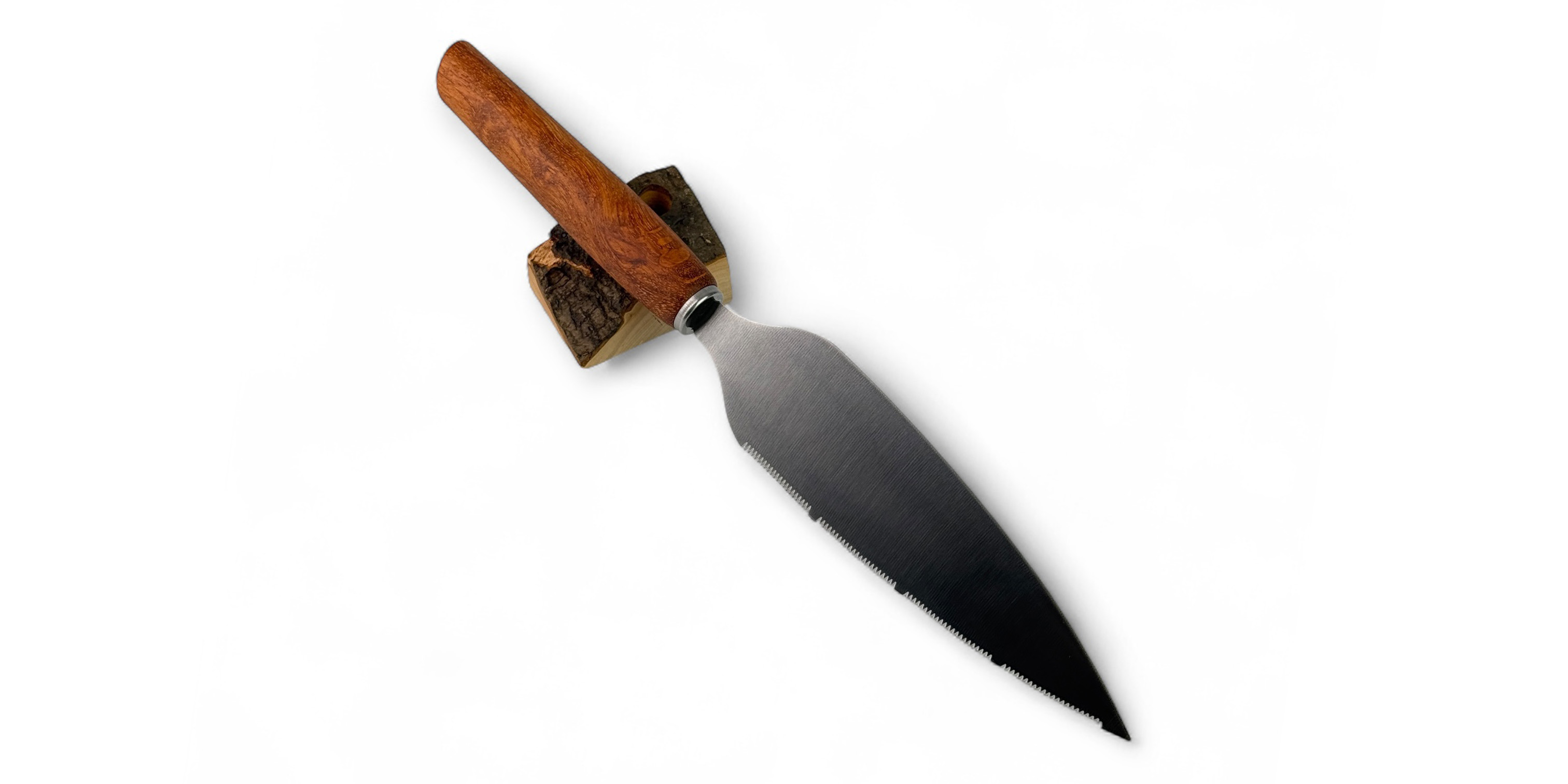 Das Tortenmesser mit edlem Holzgriff. Das Tortenmesser, ist der perfekte Helfer für jeden Kuchen und Tortenliebhaber. Das Holz ist mit natürlichen Ölen und Wachsen versiegelt und somit vollkommen lebensmittelecht. Das Tortenmesser ist >Made in Germany< und besteht aus hochwertigen Edelstahl aus Solingen. Das Tortenmesser hat auf der einen Seite sehr scharfe Zacken. Das Tortenmesser ist nicht für den Geschirrspüler geeignet.All meine Hölzer sind aus der Region und heimisch. Sollte sich doch mal ein exotisches Holz finden, dann stammt dieses aus einer Schreinereiauflösung oder Brennholzkisten von regionalen Schreinereien. Ich erwerbe keine geschützten Hölzer oder welche die erst eine Weltreise auf sich nehmen müssen um nach Franken zu kommen. Abgesehen davon haben wir bei uns so wunderschöne Hölzer, dass es gar nicht nötig ist. Dekoration und Produkthalter sind nicht im Kaufpreis enthalten.
